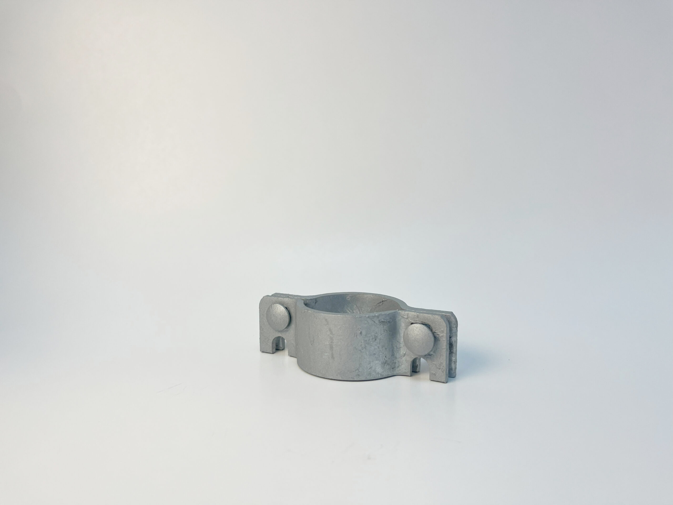 This component is part of an assembly for a fork latch, which is used to secure gates. It’s collar design allows it to be fastened around a vertical post via a pair of carriage bolts. This part is then connected to a fork which allows it to slot over gate posts and prevent the gate from swinging open and closed. It’s design leave’s room for a padlock or other locking device when used in tandem with a fork.